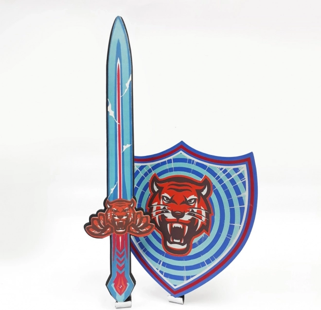Foam sword and shield with a tiger motif for safe children's play. Lightweight, soft set ideal for dress-up and carnival costumes.