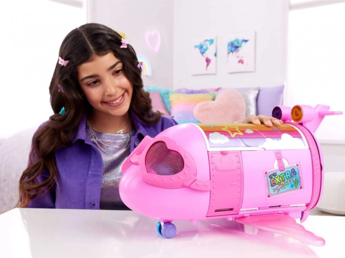 The pink BARBIE Extra Fly Minis jet brings children a world of fantasy full of color and style. The opening roof, folding steps, and rear flap that becomes a rainbow “runway” turn every flight into a fashion show. The mini pilot doll with pink hair, a heart cap, and cloud earrings gives the play a unique character.