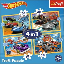 A set of four puzzles featuring the legendary HOT WHEELS series by Trefl will delight children aged 4 and up. The different piece counts (35, 48, 54, and 70) support gradual learning, develop fine motor skills, focus, and perception. Thanks to the sturdy cardboard quality and bright colors, kids will enjoy fun at home and on the go.