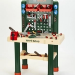 The workshop provides plenty of space for solo or group play: a wide workbench, storage boxes for accessories, and holes for screwing and hammering support motor skills, patience, and imagination. Thanks to the rich equipment, children can practice basic “craft” activities and learn to keep their tools tidy.