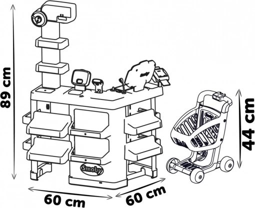 Supermarket with a cash register, fruit/vegetable section, and a scale (new mechanical scale: the displayed weight adjusts according to the weighed food). The child can set the clock and the open/closed sign. Includes 42 accessories: pasta, cookies, cereal, milk, 6 pieces of fruit and vegetables, 1 pie, 2 macarons, 2 cans, 1 electronic barcode scanner with sound and light, 1 credit card, 4 receipts, 9 coins, and 12 banknotes. The cash register has a cash drawer, a microphone, and a credit card reader. Trolley included.
