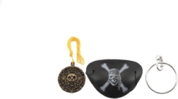 An eye patch, a medallion with a cord, and a ring complete the pirate look and spark imagination for role play.