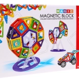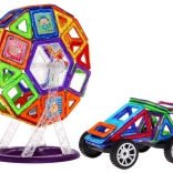 | - 56 colorful magnetic blocks in various shapes (rectangles, triangles, trapezoids, squares, etc.), - 42 plastic filler blocks (squares), - carousel base, - 2 side supports that hold the carousel and allow it to rotate, - 2 axles for wheels, - 4 wheels, - 3 sheets of colorful stickers - pattern booklet with sample designs for carousel constructions and little cars, - aesthetic colorful packaging, ideal for gifts | |