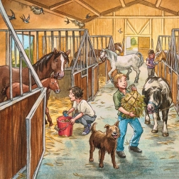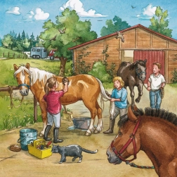 - 3 different scenes — stable life, horse care, and a countryside ride.