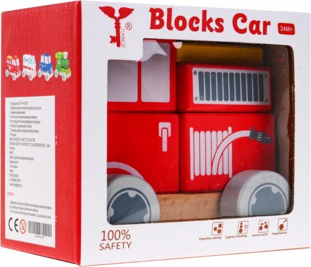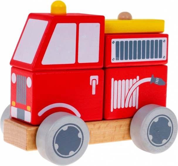 Build your own fire engine from a set of wooden blocks. The child places the pieces onto two pegs on the base, creating a simple puzzle that supports hand–eye coordination, patience, and logical thinking. Smoothly finished wood and durable paints are gentle on little hands and the environment.