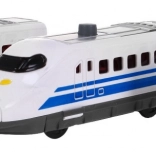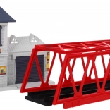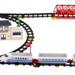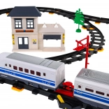 The set includes locomotives, wagons, a railway station, a bridge, and decorative elements such as trees or traffic signs. This toy provides an interactive and creative experience for both children and parents.