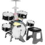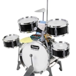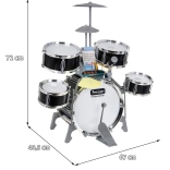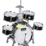 The multifunctional children's drum set contains 5 drums, 2 electronic cymbals (plastic) and one metal cymbal, control panel, microphone, 2 drumsticks, and 6 sheets with notes for easy learning. The set is powered by three AA batteries or a USB cable.