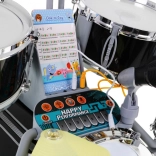 Percussion effects and light elements are activated when hitting the drums and cymbals with sticks. The drums can be connected to a phone for pulsating light rhythms, helping the child learn to play drums. The control panel allows phone or headphone connection and adding musical backgrounds.