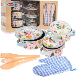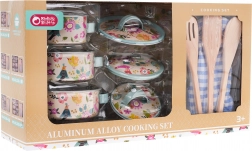 This carefully crafted and durable aluminum kitchen set for children offers a great opportunity for pretend cooking. The set is intended for children aged 3 and up and includes a rich selection of 10 pieces, including pots with lids, kitchen utensils, and an oven mitt.
