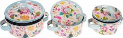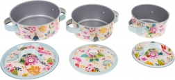 The set includes three aluminum pots with lids, perfect for all kinds of pretend cooking.