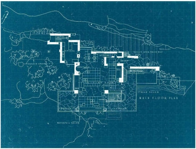 The puzzle features on one side a motif of one of the most famous houses—the waterfall house, Fallingwater—and on the other side the architectural plan of the building. The pieces have two surface finishes—glossy and matte—making it easier to distinguish the two designs. Assembled puzzle size approx. 61 x 46 cm