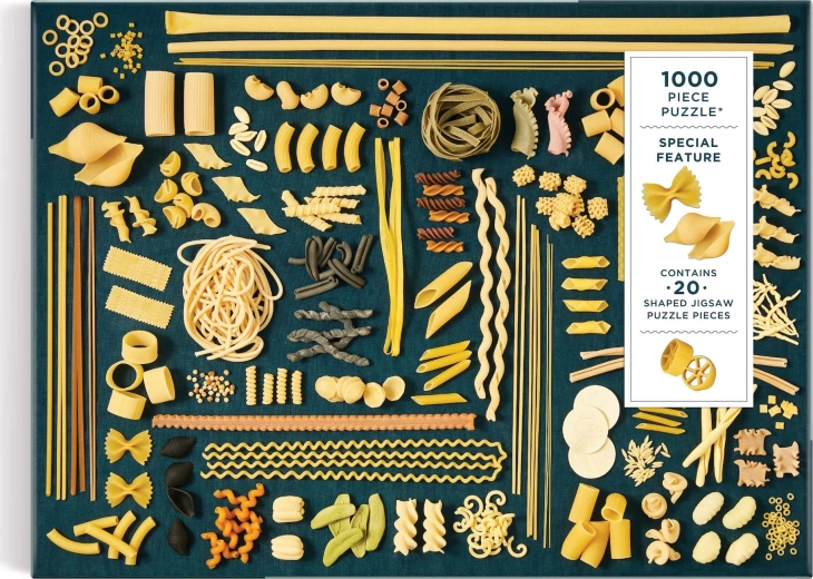 The puzzle includes 20 special pasta-shaped pieces. The package includes a reference image of the motif. Assembled size approx. 69 x 51 cm