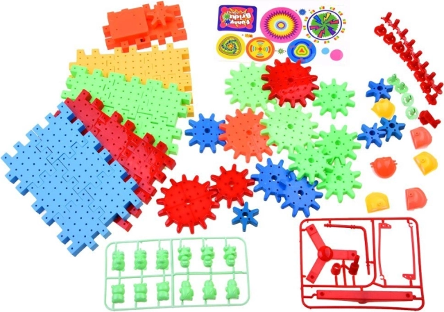 The set includes a gear powered by an AA battery that children can use to animate their constructions.