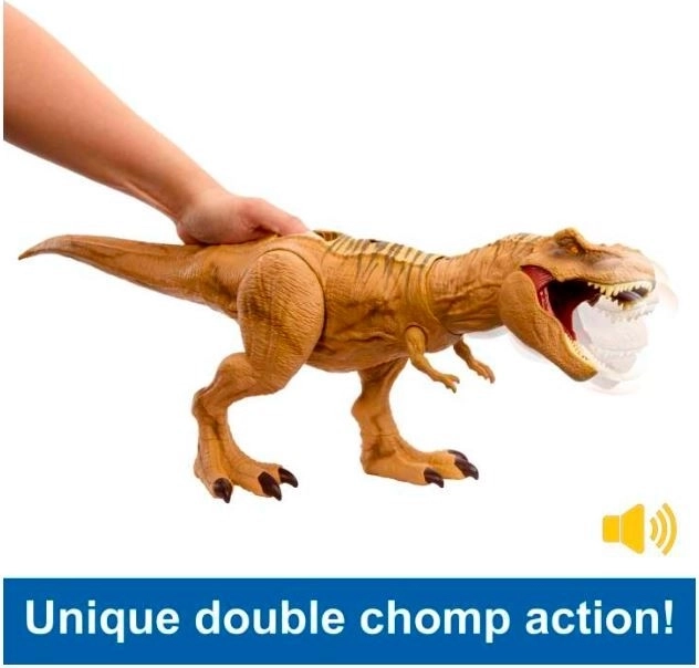 Press the button and the T‑Rex opens its jaws and turns its head to the side, accompanied by a realistic dinosaur roar inspired by the Jurassic World films.