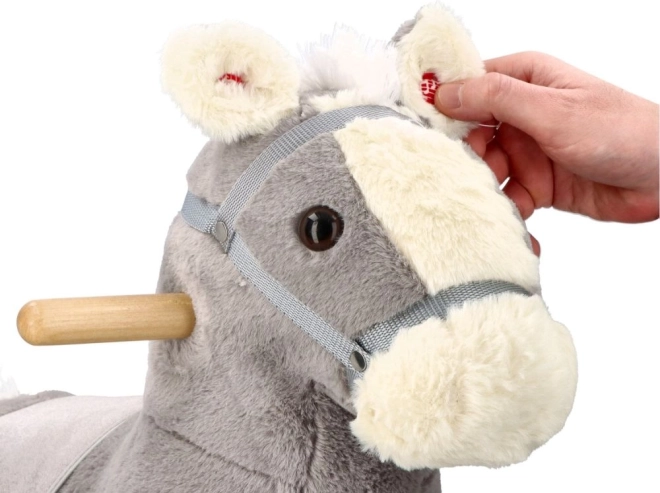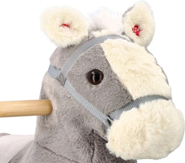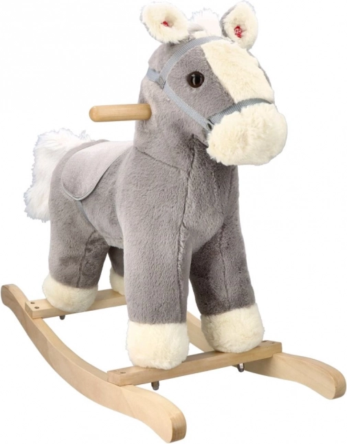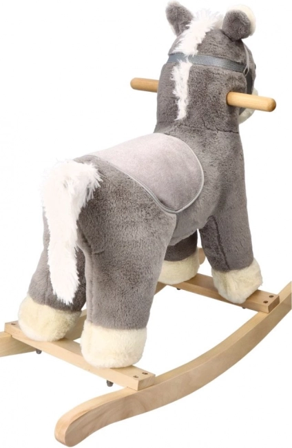 The horse stands on a sturdy wooden base that offers stable and safe support for children's rocking.