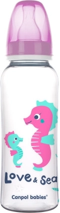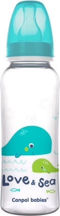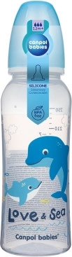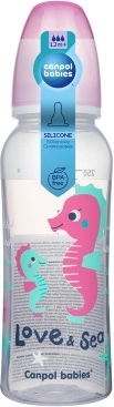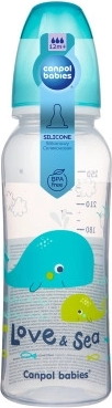 The practical Canpol babies feeding bottle made of high-quality polypropylene with a capacity of 250 ml is lightweight, durable, and safe for everyday feeding. It is BPA-free and decorated with adorable sea-themed motifs from the Love & Sea collection. It includes a round silicone teat with a fast flow for comfortable drinking.