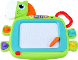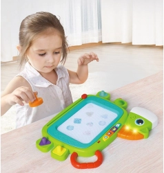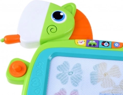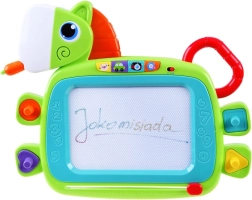 This colorful magic board has many amazing features that encourage creativity and the development of children's fine motor skills. You can draw, write with the stylus, or create patterns using stamps. Once the drawing is completed, the picture can easily be erased with the sliding eraser mechanism. Interactive play is accompanied by light and sound effects: