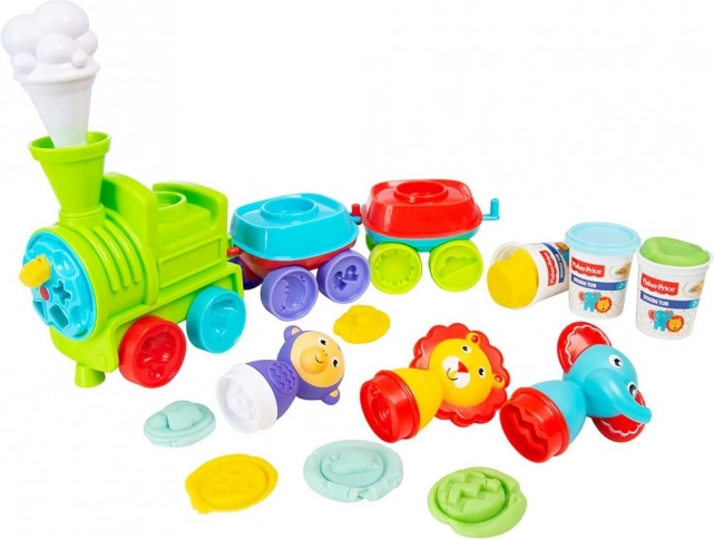 - Locomotive, 2 carriages, 3 animal figures (monkey, elephant, lion), integrated molds and stamps, cloud-shaped roller, tubs of modeling clay