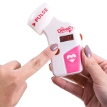 Stethoscope with a blinking heart, thermometer and blood pressure monitor with backlit readings, otoscope, syringe, scissors, reflex hammer, and more accessories.