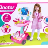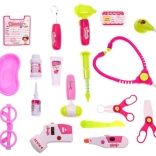 - Medical trolley with panel, glasses, stethoscope with light, thermometer with adjustment and backlight, otoscope with light, blood pressure monitor with adjustment and backlight, reflex hammer, syringe, mirror with light, 2× scissors, scalpel (toy), bowl, pretend disinfectant cream, pretend eye drops, pretend pill jar, doctor name badge, patient card