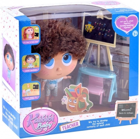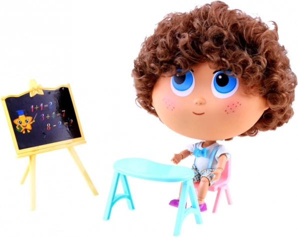 Cute teacher doll Tymek for school role-play brings children lots of imagination and fun. The set includes a blackboard, desk and chair. The doll has movable joints and a head that rotates 360°, big blue eyes, freckles and curly hair. Great for role-play and developing creativity.
