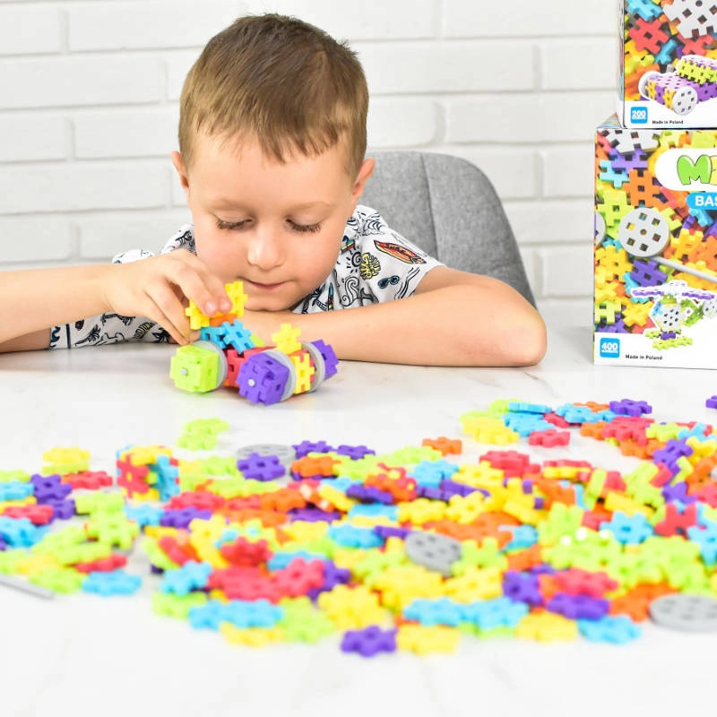 The MELI CONSTRUCTOR 400 set is a rich kit for young and older builders alike. It includes 370 basic pieces and special elements – axles, wheels, and hexagons – that expand building options from simple structures to functional vehicles. The pieces feel pleasant to the touch, connect easily, and support focus and patience.