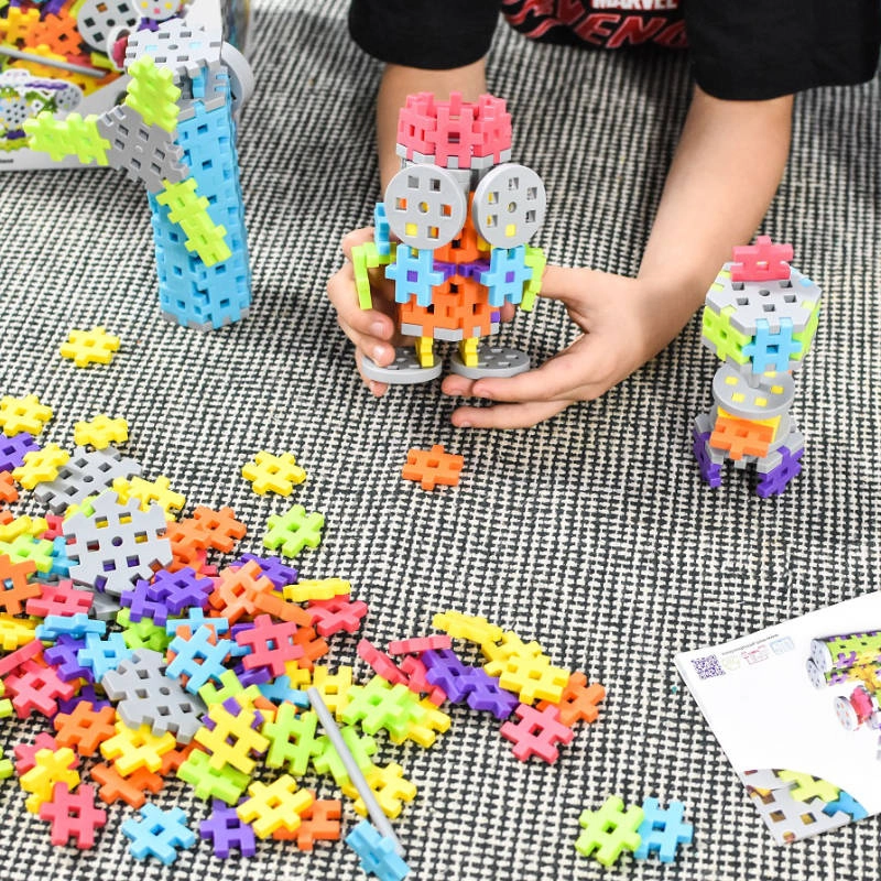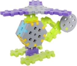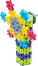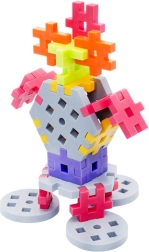 Colorful pieces in the shape of crosses and connectors snap together easily. The included instruction booklet inspires new models and builds.
