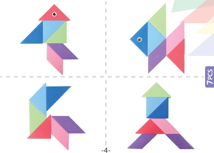 The magnetic tangram brings the classic Chinese puzzle into a modern form. Pieces with integrated magnets hold firmly together, allowing children to create both flat and 3D models—from animals to original objects. The game develops fine motor skills, spatial perception, and creativity, while also teaching colors and shapes.