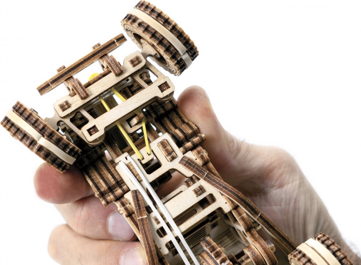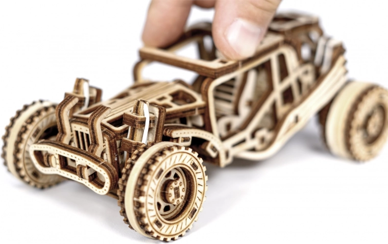 This realistic 1:32 buggy model combines thoughtful design and mechanical functions that impress both during assembly and when driving. Thanks to laser-cut birch plywood parts, everything fits together precisely, resulting in an eye-catching collectible and an educational kit.
