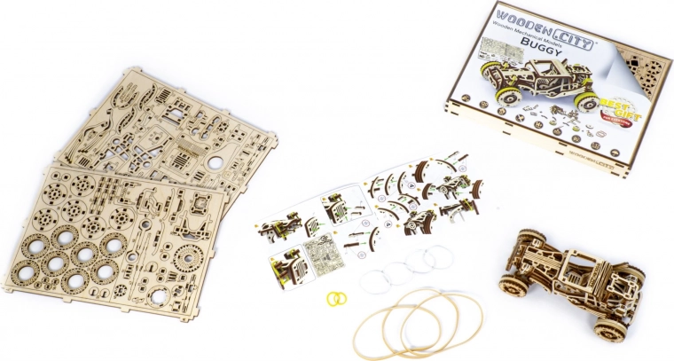 Discover the joy of building with a functional wooden buggy model from WOODEN CITY. This detailed 3D puzzle model features independent wheel suspension, a flywheel mechanism, and rubberized return wheels for smooth motion. It assembles without glue or tools and will delight every sports car enthusiast.
