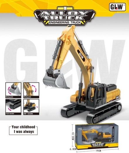 A realistic construction excavator for kids aged 3+ featuring a metal bucket, a 360° rotating cab, a movable arm, and rubber tracks. The durable build combines metal parts and high-quality plastic for long, safe play at home or in the sand.