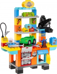 - workshop building parts, lift, “compressor” for inflating tires, toy car, screwdriver, 2× adjustable wrench, gear wheel, opening cabinets, stickers, manual