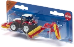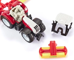 A realistic model of the Steyr tractor with front and rear Pöttinger mowers by Siku delights young farmers and adult collectors alike. It features a metal build with plastic parts, highly detailed workmanship, rubberized wheels, and movable and removable attachments for even more fun play and attractive display in a collection.
