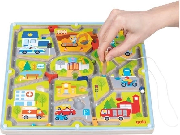 Discover the fun magnetic city maze from GOKI, where children use a magnetic pen to guide little cars through streets full of intersections and no-entry signs. The game develops fine motor skills, concentration, and basic traffic awareness thanks to clear visual cues and safe wooden construction.