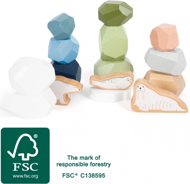 Enjoy creative play with Wooden Balance Stones Arctic, perfect for developing fine motor skills and focus in your children. This toy encourages patience and creative thinking, making playtime meaningful. The set consists of 11 balancing stones and 4 figurines depicting animals and an ice floe, facilitating imaginative play.