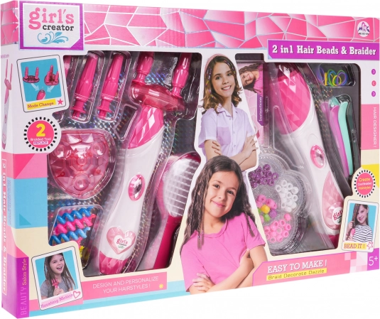 - Hair braider, - 2 interchangeable tips for braiding hair into classic braids and for twisting two strands, - Hair bead applicator, - Hairbrush, - Bead box, - 76 multicolored beads, - 2 x hair clip, - 5 hairpins, - 2 x manual, one for each device, - 20 x hair elastic. |
