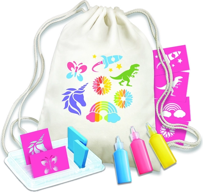 - Drawstring backpack (27.5 × 36 cm), 3 bottles of fabric paint, 6 adhesive stencils, set of scrapers, printing stand, detailed instructions