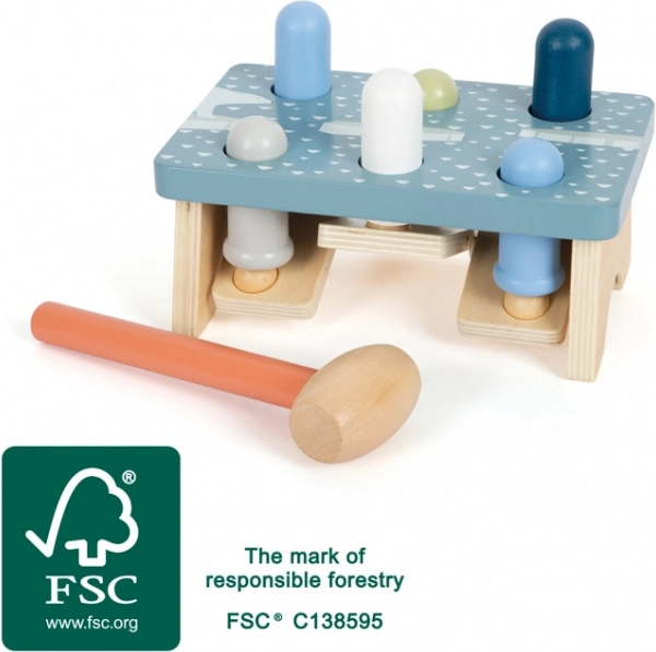 A classic wooden pound-a-peg made from certified FSC wood will delight children from 1 year. Colorful pegs and a winter polar bear theme support fine motor skills, hand-eye coordination, and an understanding of cause and effect. The robust design ensures a long service life and safe play.