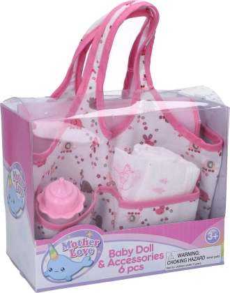 A practical set of doll accessories that makes playing mom and dad easier for kids. The package includes everything needed for everyday care – a accessory pouch, a diaper, a bottle, a cloth diaper, and a changing mat.