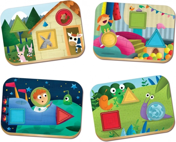 This toy enhances children's attention, develops their imagination, and teaches them to recognize basic geometric shapes and colors in various settings: on the farm, in the playroom, in the meadow, and in space.