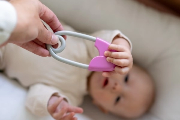 The pink and gray contrasting colors promote visual perception and attract a baby's attention.