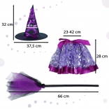 Great children's witch costume offers a complete outfit with three accessories: a black and purple hat, a purple skirt, and a magic broom. Ideal for Halloween and themed parties.