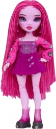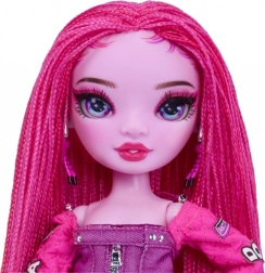 The doll features vividly pink braided hair, striking blue eyes, and detailed facial features that accentuate its stylish appearance.