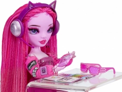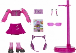 The doll comes with various fashion accessories including pink sunglasses, earphones with ears, and a pink stand, supporting creative play and enabling the creation of unique fashion looks.