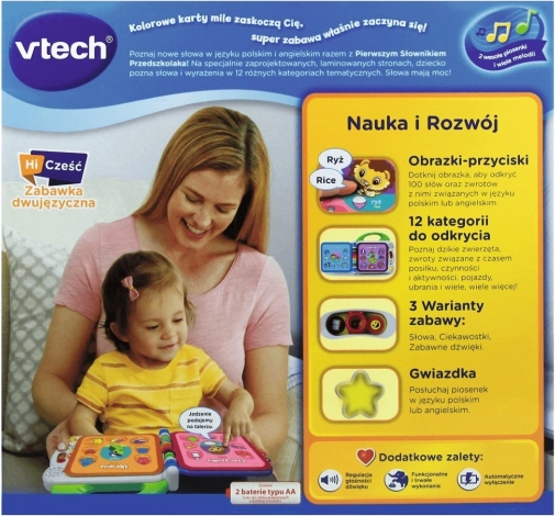 Explore the world of words and sounds with the VTech Trefl interactive book. Each touch on a picture triggers the name, sound, and often a fun fact related to the topic. Children naturally develop hearing, visual attention, and fine motor skills while building vocabulary in Polish and English. The book is lightweight, durable, and thanks to the practical handle, little explorers can take it anywhere.