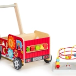 The wooden walker in the shape of a fire truck is the ideal aid for your child's first steps. The walker is designed to provide stability while also offering fun through various interactive features such as gears, bead mazes, and a shape sorter.