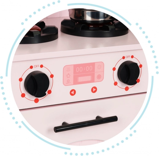 Rotating knobs on the kitchen allow simulation of cooking on the stove and in the oven. Children get a safe space for their culinary experiments.
