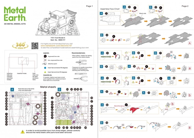 The package includes 2 large steel sheets and a detailed assembly guide. Tools are not included. Prepare small snips and pliers to successfully assemble the realistic model.