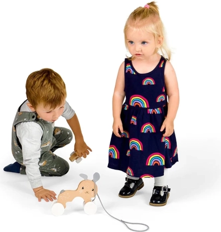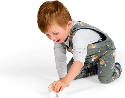 Four sturdy wheels with a geometric pattern roll smoothly on flat surfaces, while the grey pull cord is easy to grip even for small hands. The toy helps develop dexterity, balance, and coordination skills, encouraging active movement and imagination.