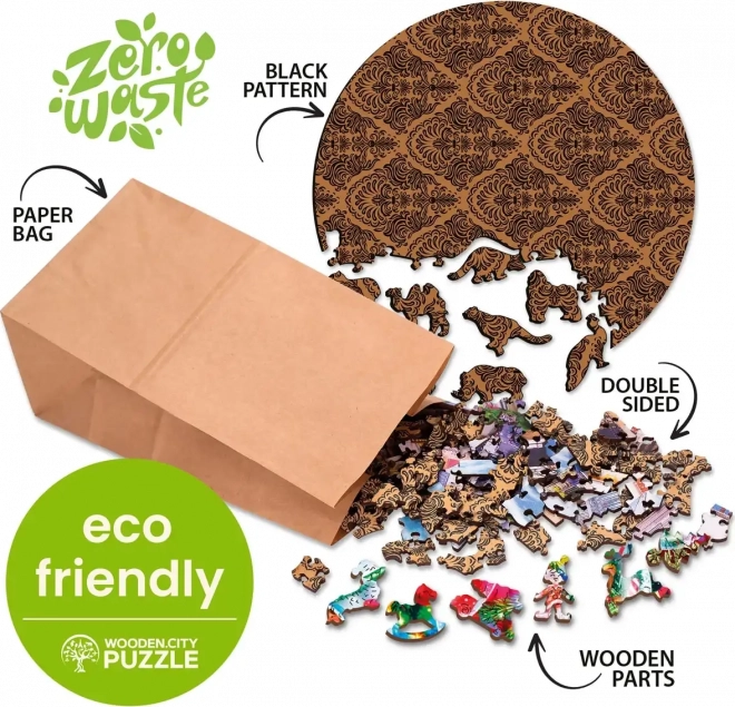 This WOODEN CITY wooden puzzle with unique animal-shaped pieces offers fun and challenge to all puzzle enthusiasts. Laser cut and plastic-free packaging.